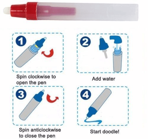 - SAFE & DURABLE--- It is environmental clean and safe for children. The back of the mat is WATER-RESISTANT nylon material, no worry about wetting the floor. The water pen is fairly indestructible and does not make a mess. NOTE: Soak the tips in water for 30 minutes prior to use for better results. The opening direction of the pen is backwards,you need to loosen the head of pen in POSITIVE direction.