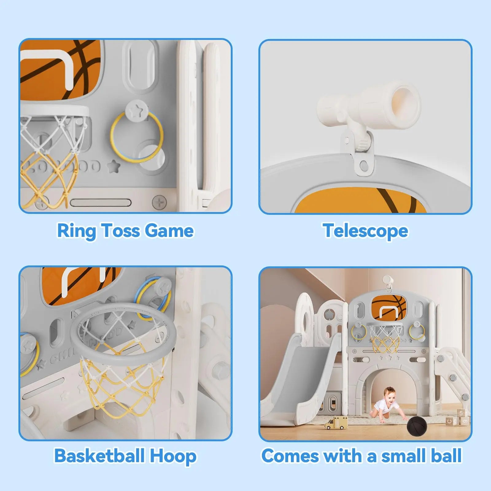 Turn playtime into an adventure with this 8-in-1 toddler playset featuring a 63.6-inch long slide, climber, basketball hoop, ball tunnel, and crawling tunnel. Designed for indoor and outdoor fun, this versatile playset keeps kids active, engaged, and entertained for hours!