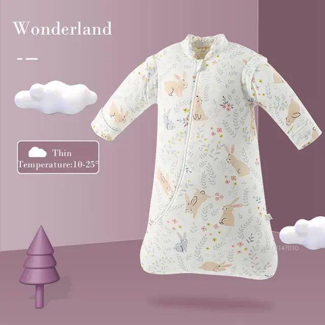 Designed with practicality and convenience in mind, our blanket features a zipper closure and detachable sleeves, allowing for easy on/off access and customizable warmth to suit your baby's needs. The bottom zip ensures hassle-free diaper changes, making nighttime routines a breeze for both baby and parent.