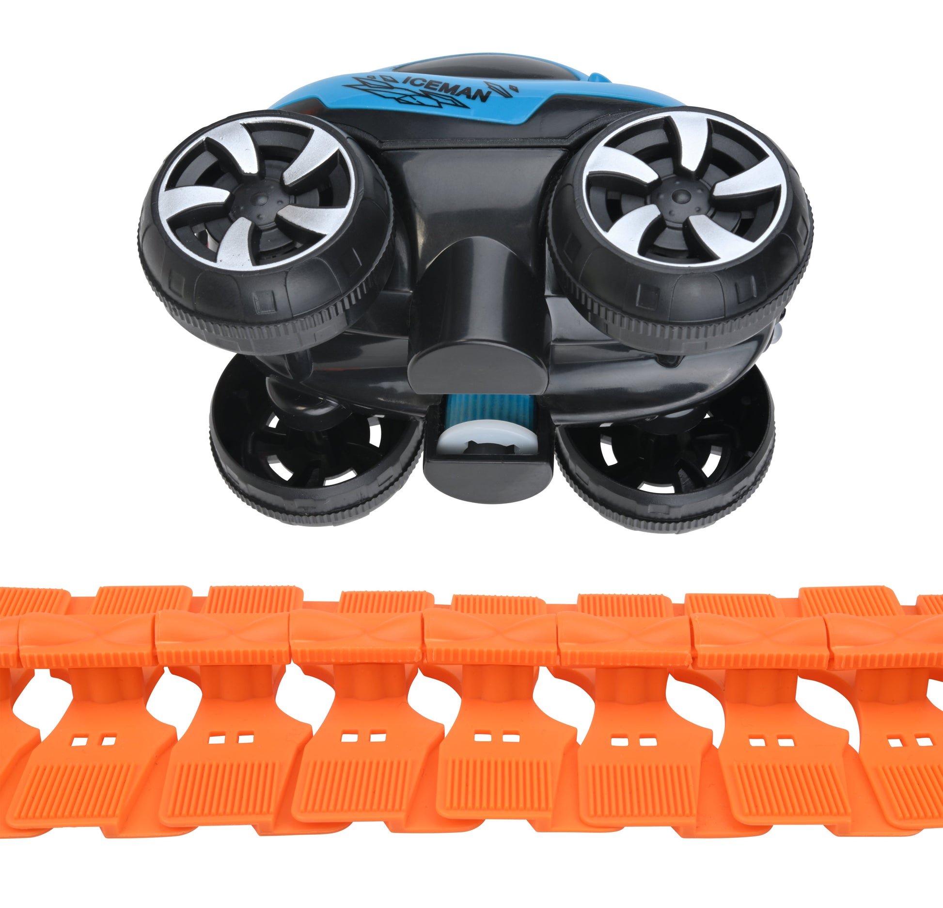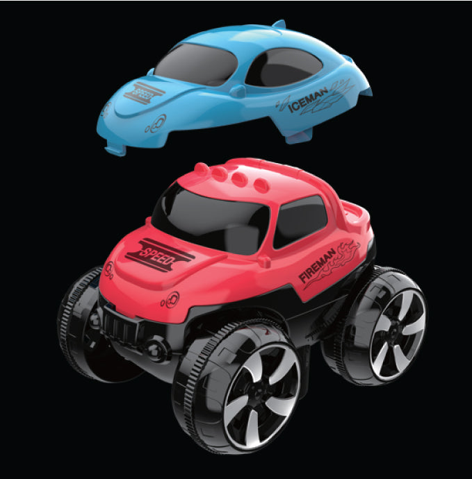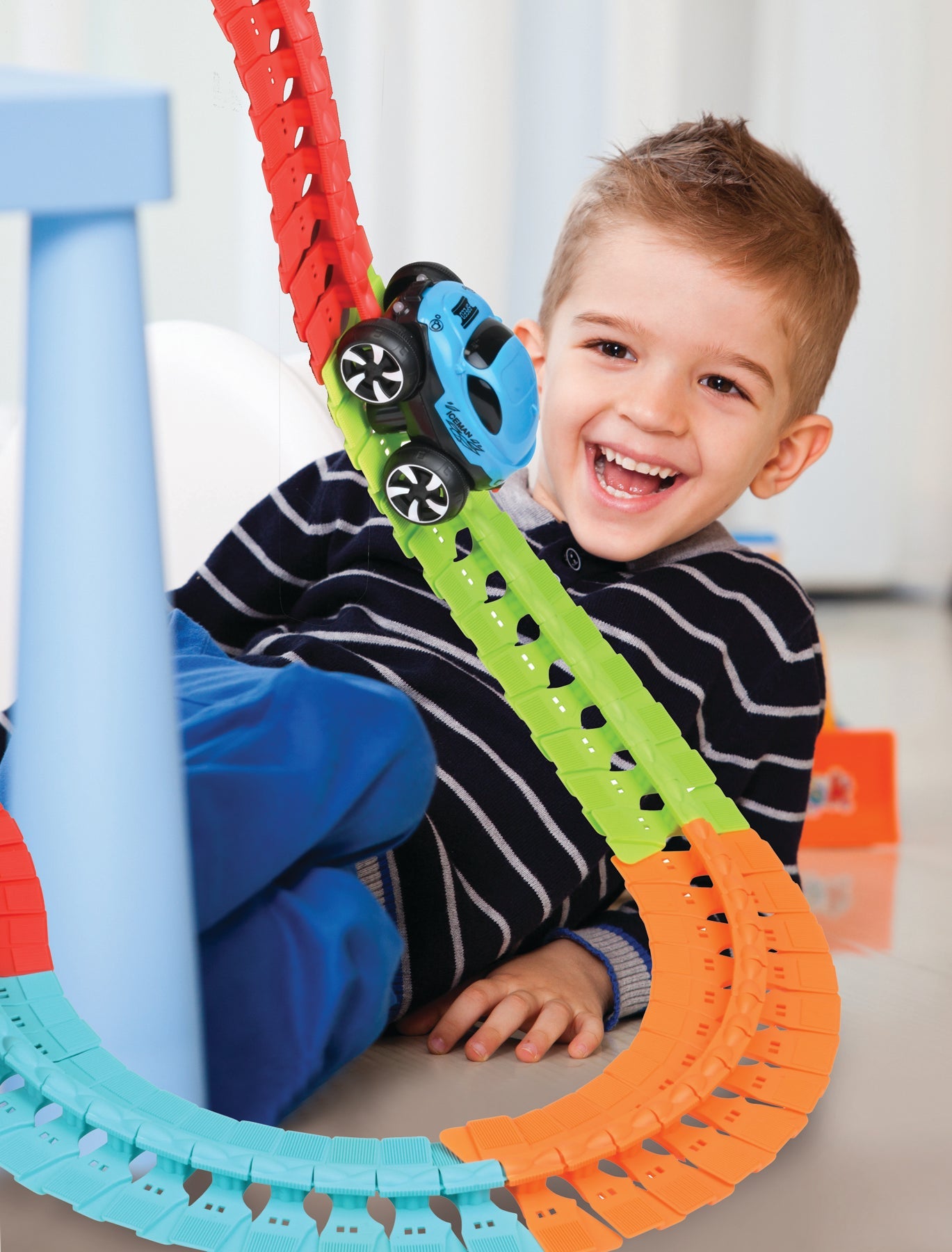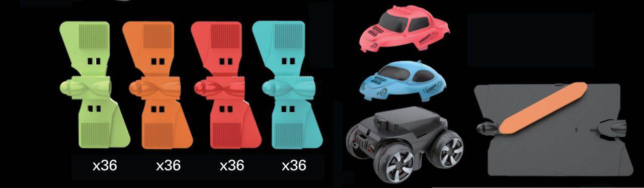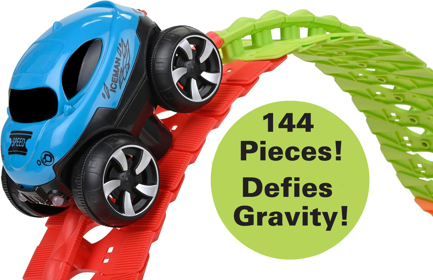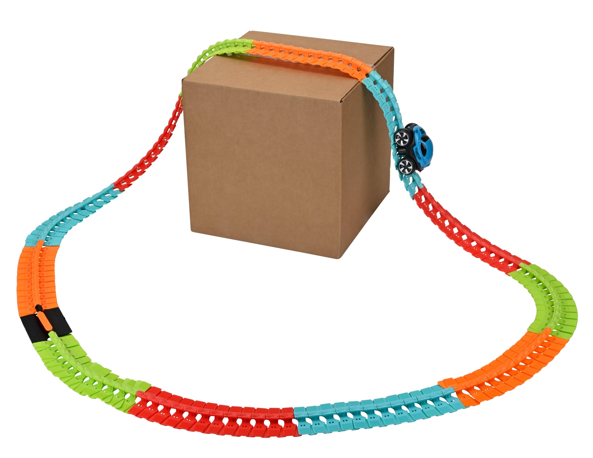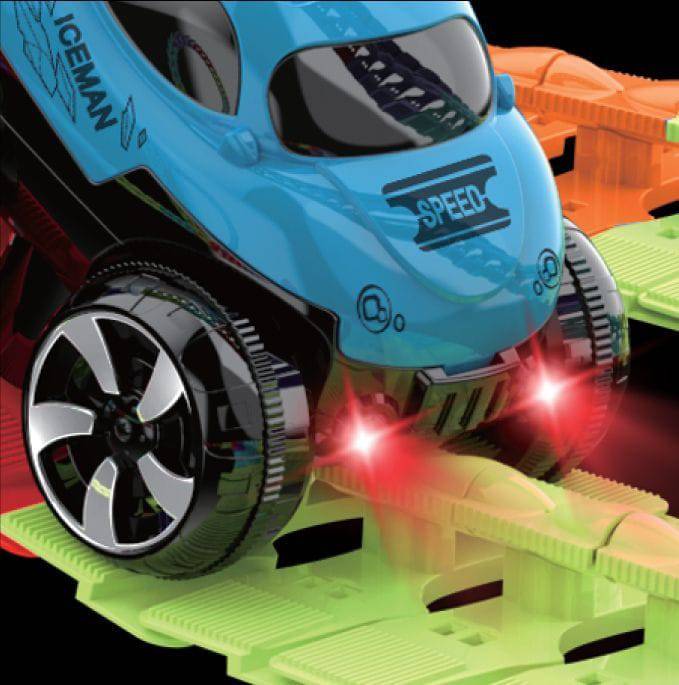 Snap the track pieces together in your own desired color pattern to create a custom roadway. Lay the finished trackway over obstacles of various sizes, including objects as high as a footstool or chair. The special grip-design of the battery-powered car allows it to amazingly climb up & over high obstacles.