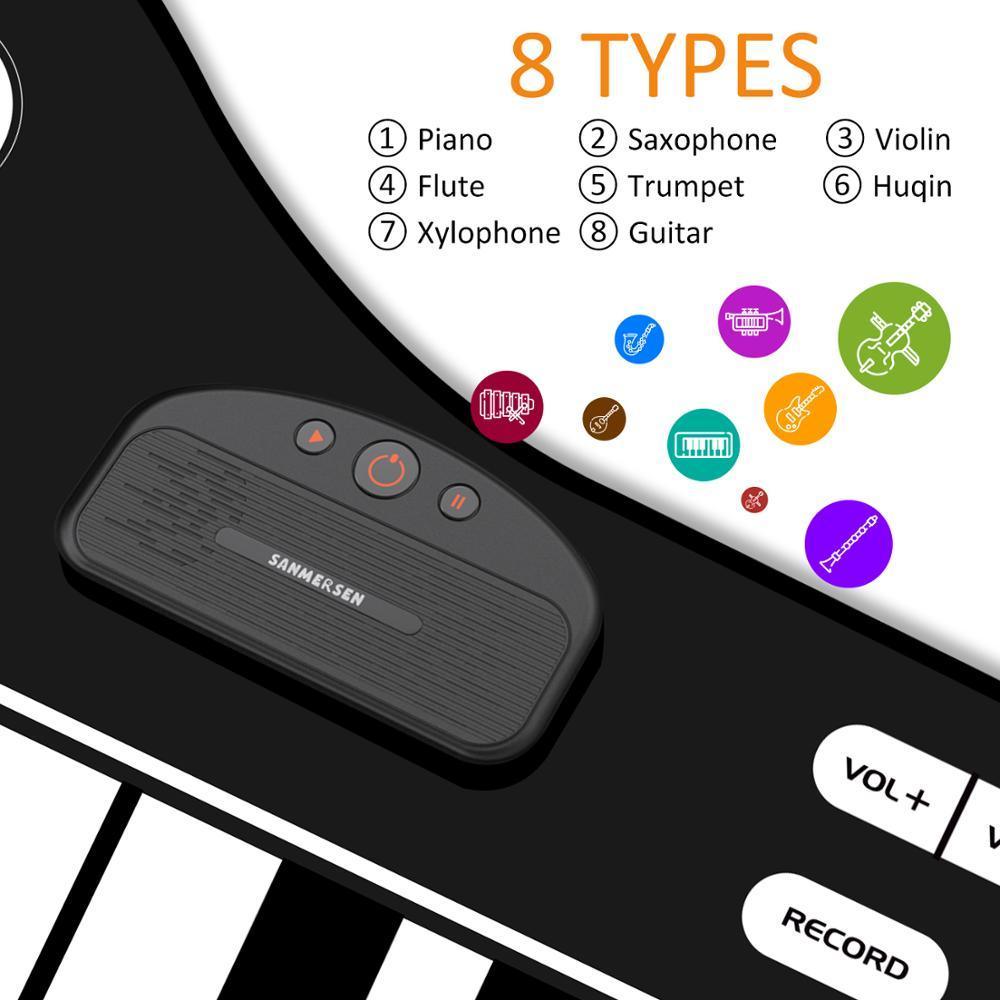 - INSTRUMENTAL SOUNDS : Kids can hear different musical instrument sounds as they joyfully dance around on the keyboard, including piano, violin, accordion, saxophone, xylophone, clarinet, guitar and flute. It is time to let the imagination run riot and create a wide variety of melodies.