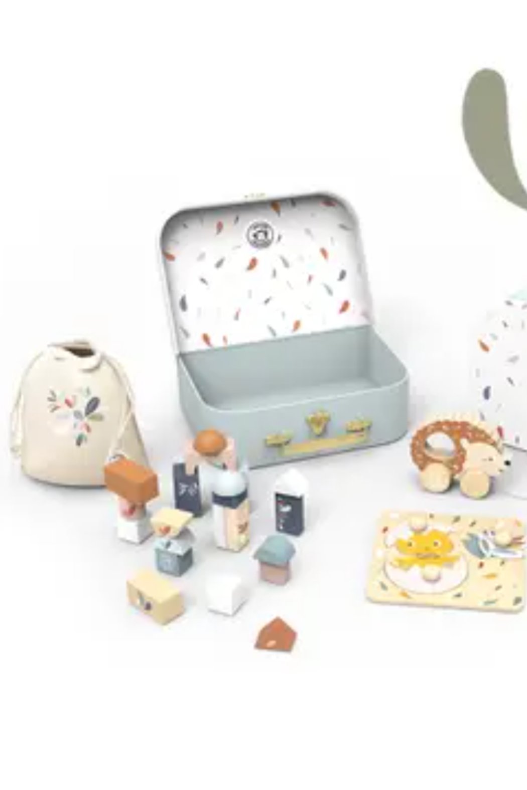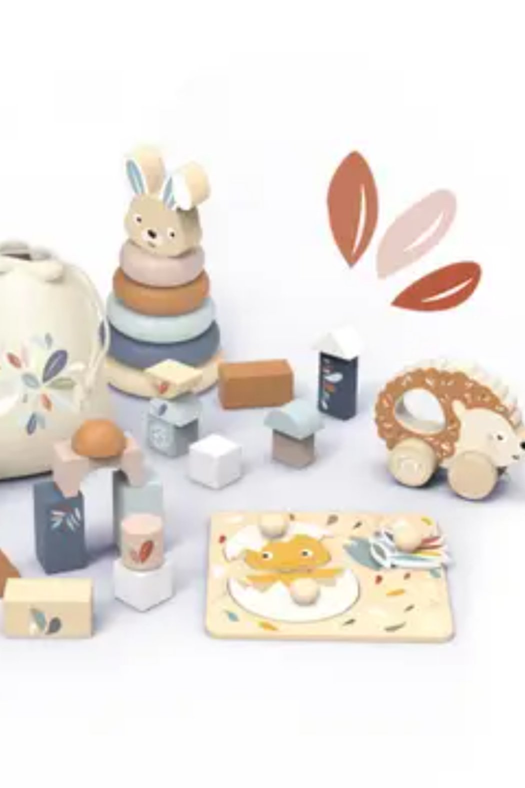 This toy box is not only visually appealing but also functional, providing a safe and spacious storage solution for your child's favorite toys. Made from high-quality wood, it ensures durability and longevity. Includes buildings blocks with fabric pouch, stacking rabbit, chick puzzle and pull-along hedgehog.