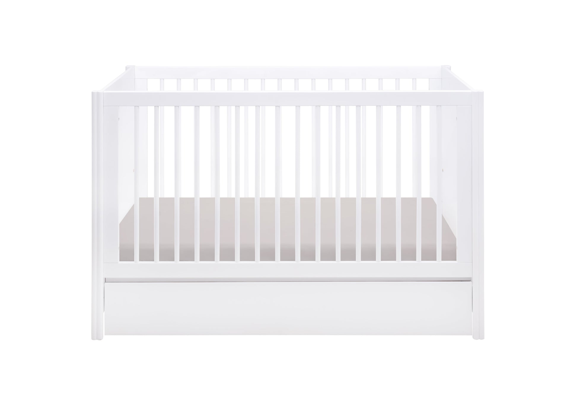 Expertly crafted from 100% solid wood, the MYLA Baby Crib is classy in white with charming scalloped edges. This multi-level crib easily converts to a toddler bed and day bed, making it a versatile and long-lasting investment. Add the optional MYLA Crib Trundle for added storage or to accommodate a sibling or guest. Toddler bar available.