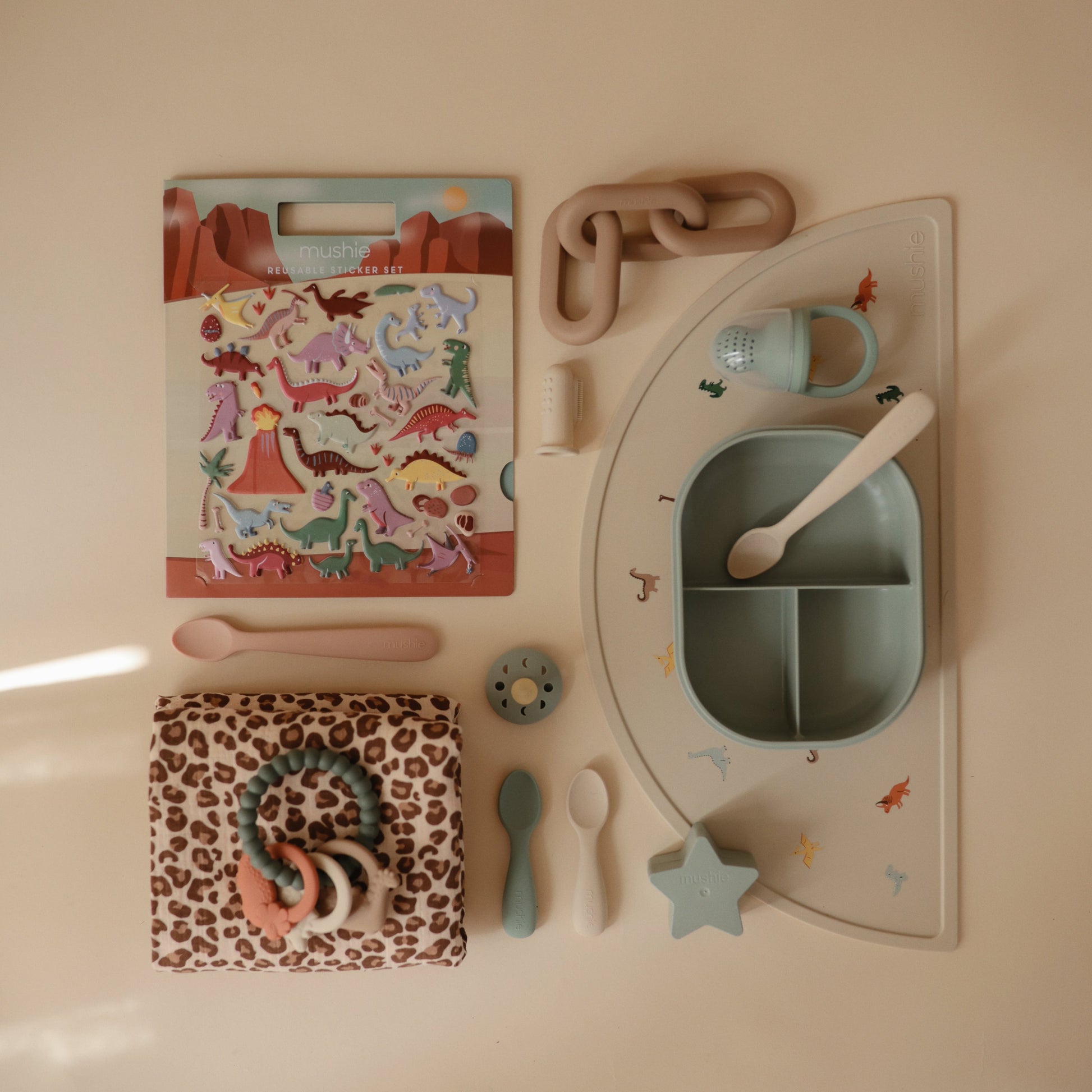 Set the stage for imaginative storytelling with a reusable sticker book that features dinosaur themes and prehistoric scenes. With puffy stickers that can be used over and over again, kids will enjoy pretend play with a variety of colorful dinosaurs. The simple carrying handles let you take playtime anywhere with easy-to-hold cutouts at the top of the book. Watch littles act out countless scenarios as they move stickers around the book and explore.
