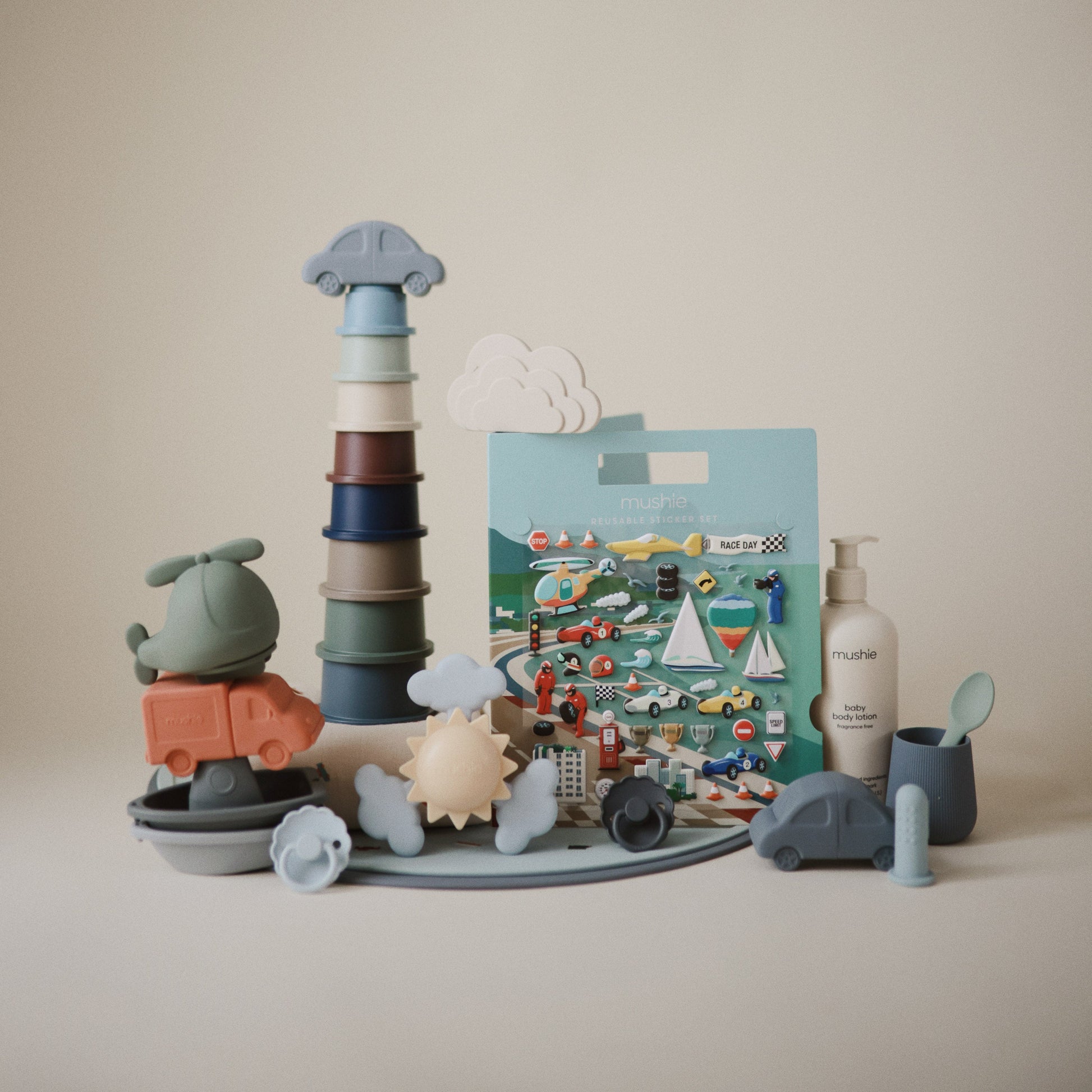 Set the stage for imaginative storytelling with a reusable sticker book that features racing themes and city scenes. With puffy stickers that can be used over and over again, kids will enjoy pretend play with a variety of colorful vehicles. The simple carrying handles let you take playtime anywhere with easy-to-hold cutouts at the top of the book. Watch littles act out countless scenarios as they move stickers around the book and explore.