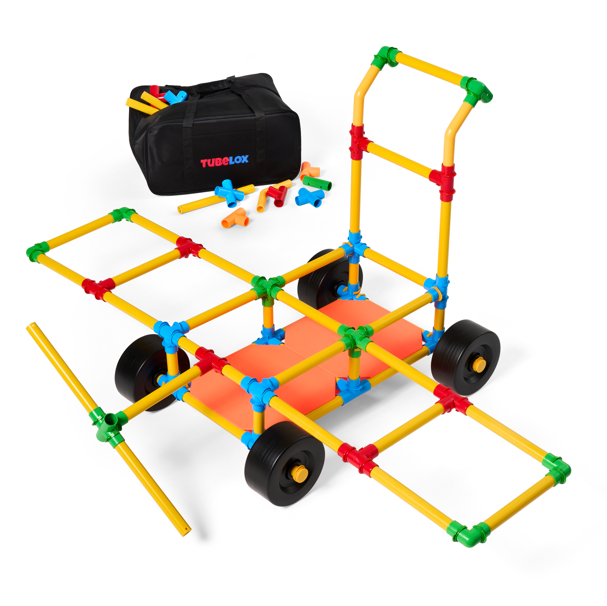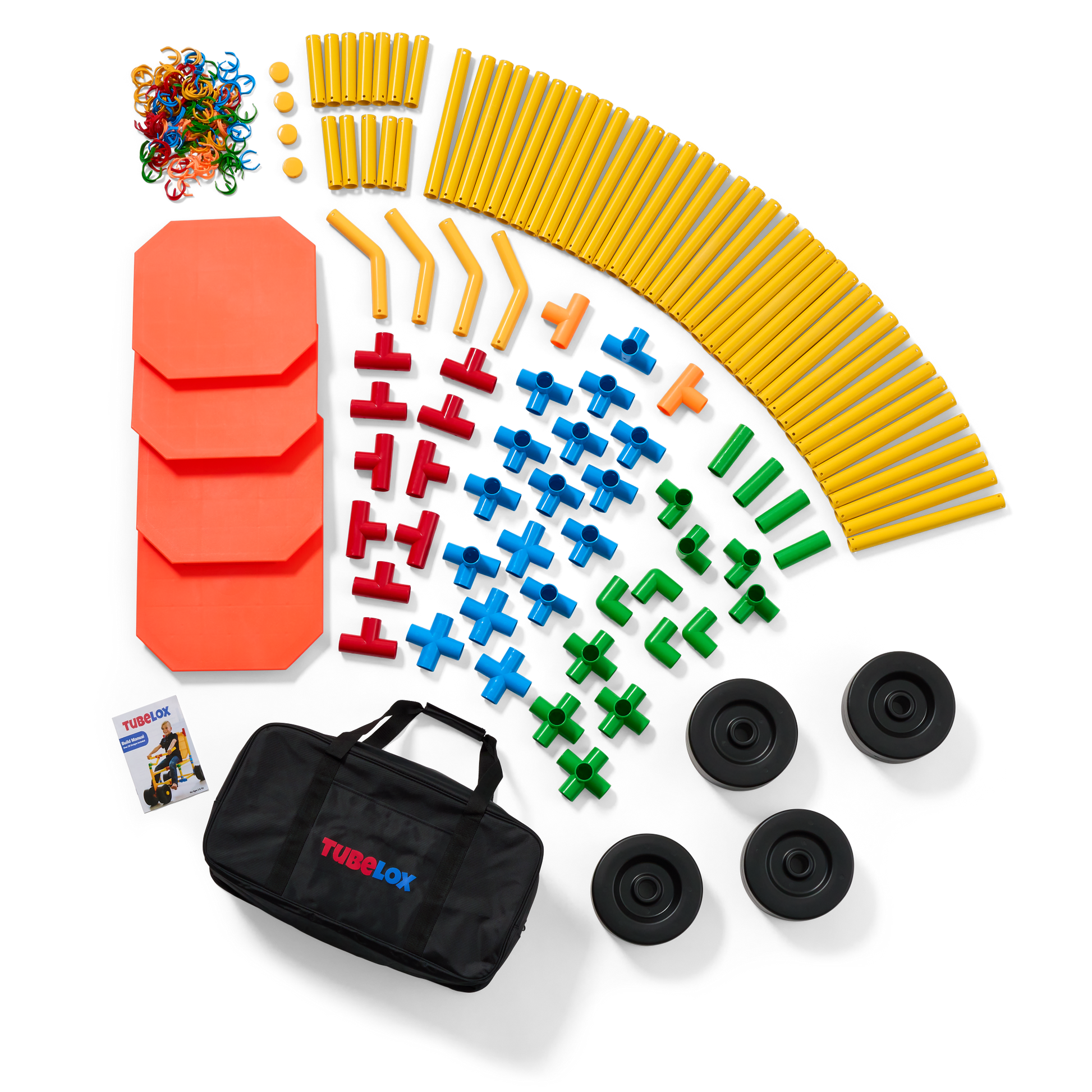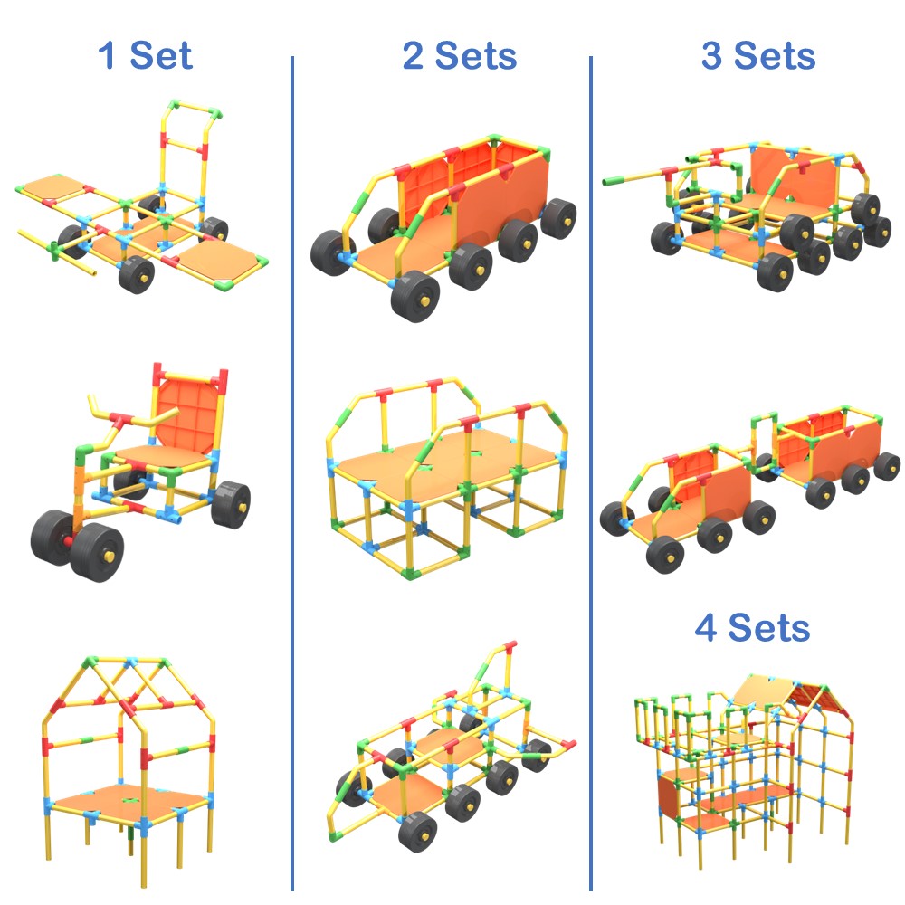 With this set, you get it all! The tubes connect with colorful attachment pieces and locking adapter clips. This allows for the toy to be sturdy and stable enough to play on unlike most constructive toys. The wheels and panels are essential. Children love building cars and testing their work with a zip around the house or the neighborhood. Tubelox is a social toy joining friends and families together while building, learning and playing. It’s not just for kids!