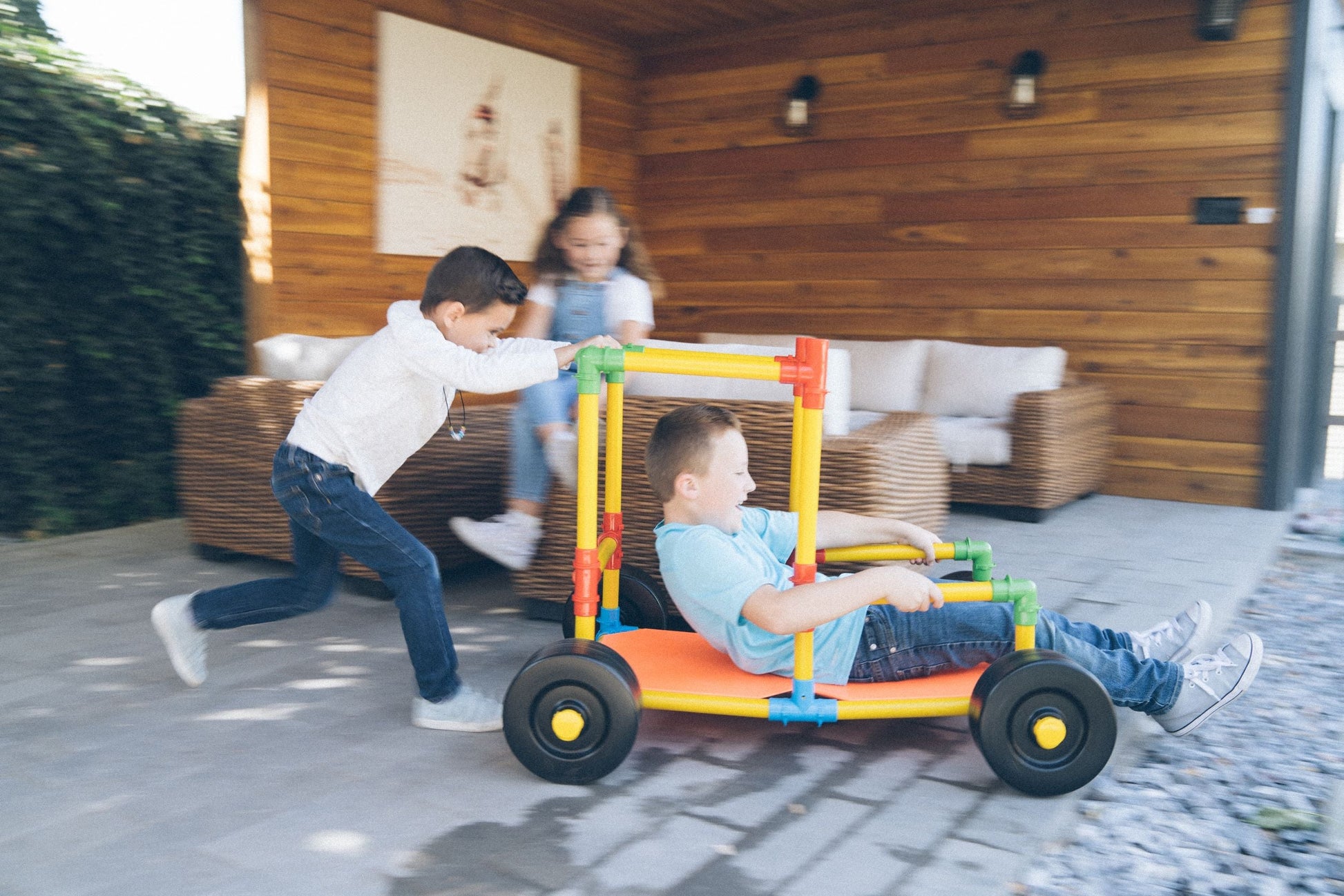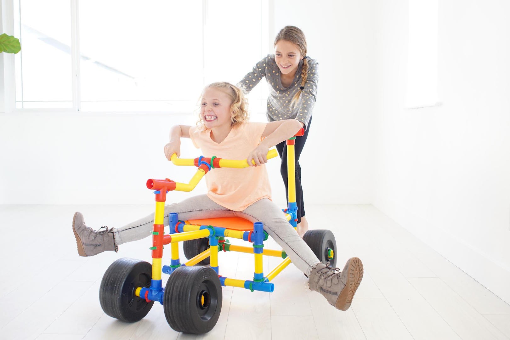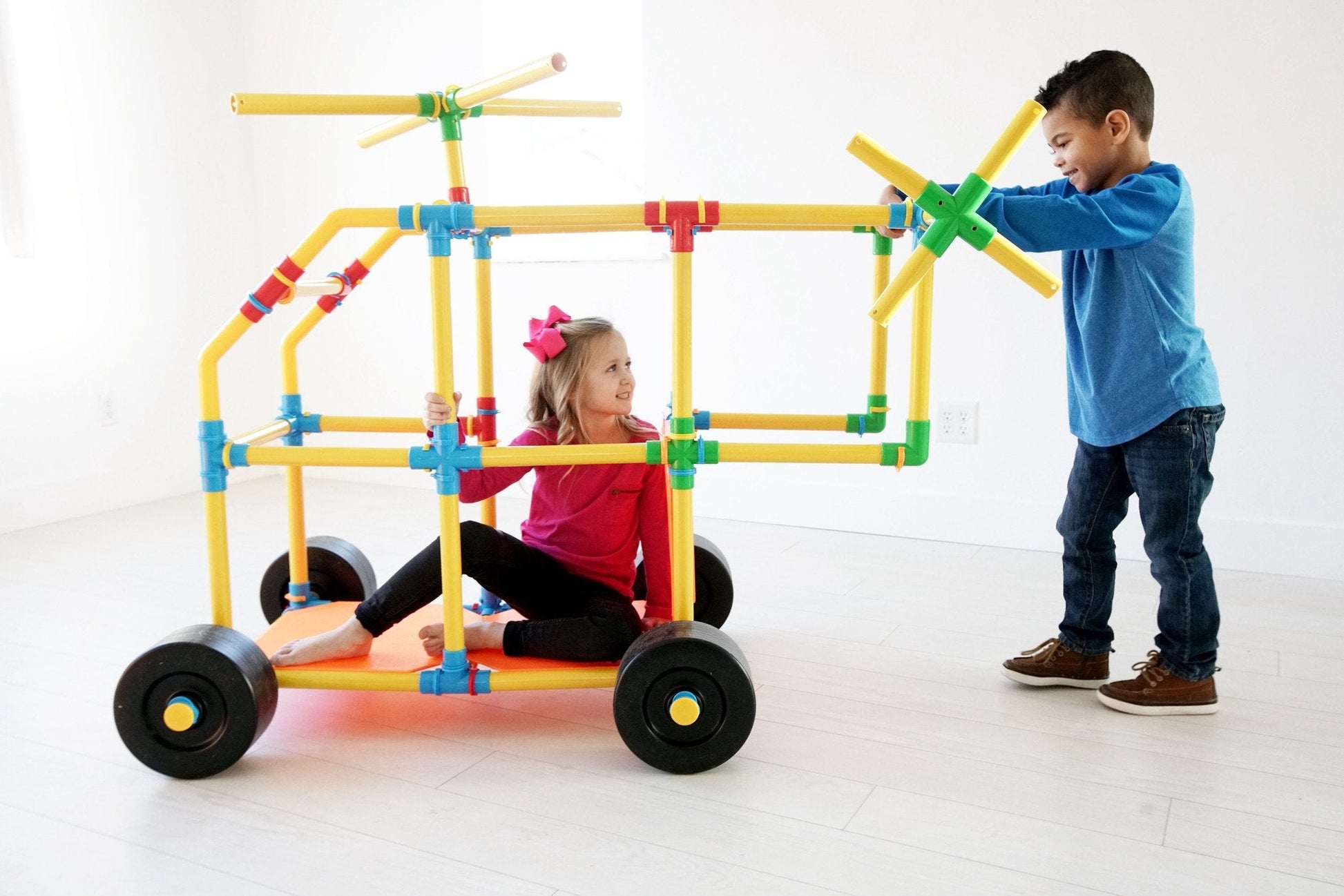 With this set, you get it all! The tubes connect with colorful attachment pieces and locking adapter clips. This allows for the toy to be sturdy and stable enough to play on unlike most constructive toys. The wheels and panels are essential. Children love building cars and testing their work with a zip around the house or the neighborhood. Tubelox is a social toy joining friends and families together while building, learning and playing. It’s not just for kids!